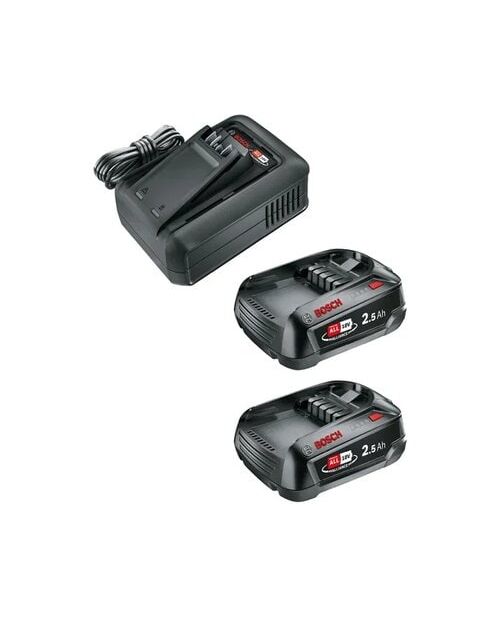 Akkusystem: Bosch 18 V POWER FOR ALL, Zubehörtyp: Akku und Ladegerät, Akkukapazität: 2.5 Ah, Spannung: 18 V, Kapazität Wattstunden: 45 Wh, Akkutyp: Lithium-Ion (Li-Ion)